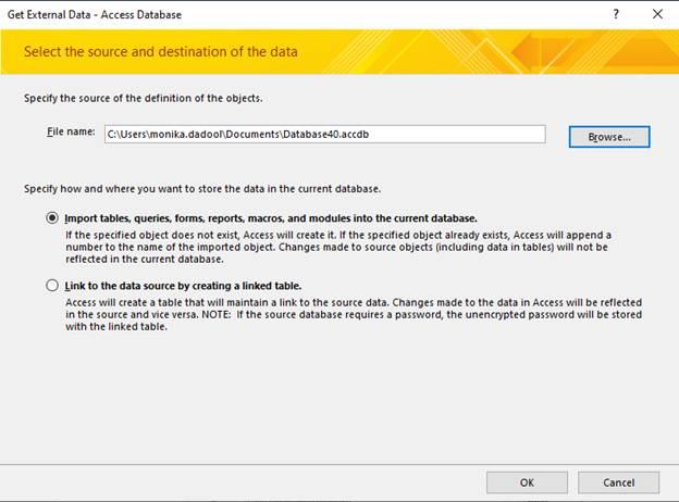 · In the same window, choose the “Import tables, forms, reports, macros, and modules into the current database” option.