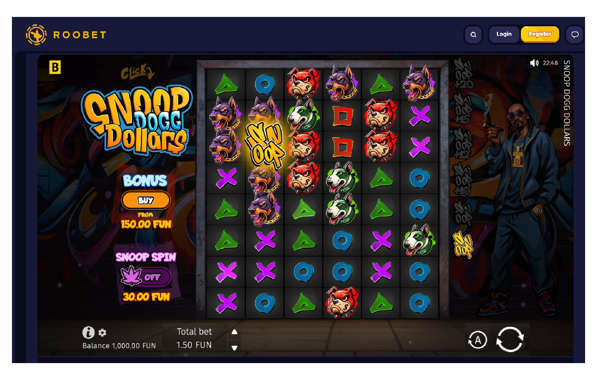 Play all the slot games with the likeness of one of the most iconic rappers of all time, the one and only D-O-Double G. Find them all in Roobet, Snoop Dogg’s official partner in iGaming. There are three games you can play right now with the likeness of Roobet’s Chief Ganjaroo Officer (CGO), like Smoke’Em, Snoop Dogg Dollars, and Snoop’s High Rollers.